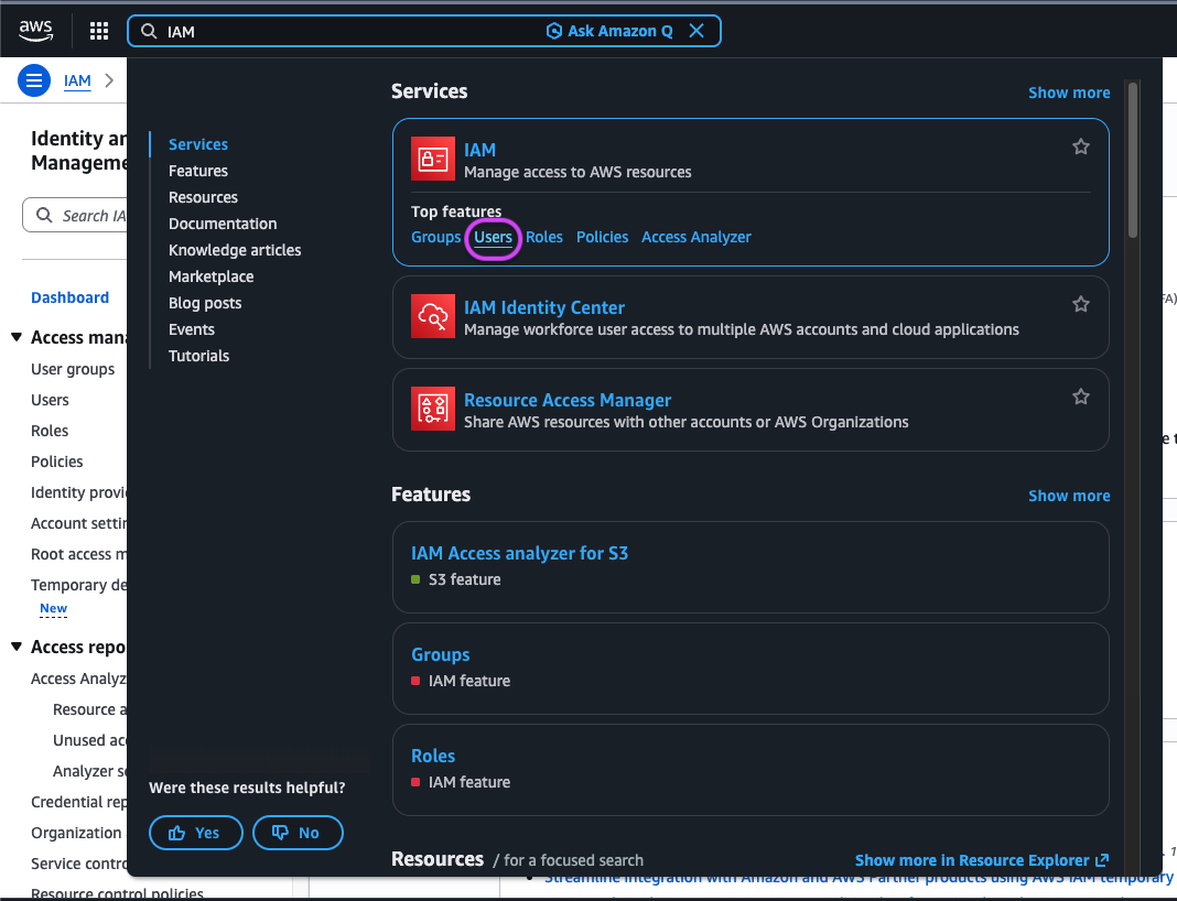 - Log in to AWS and navigate to the IAM service. In some organizations, the menu structure may differ. The IAM service can be accessed directly by searching for “IAM” in the top search bar. If the IAM menu is not visible, access permissions may be restricted and the organization administrator should be contacted.