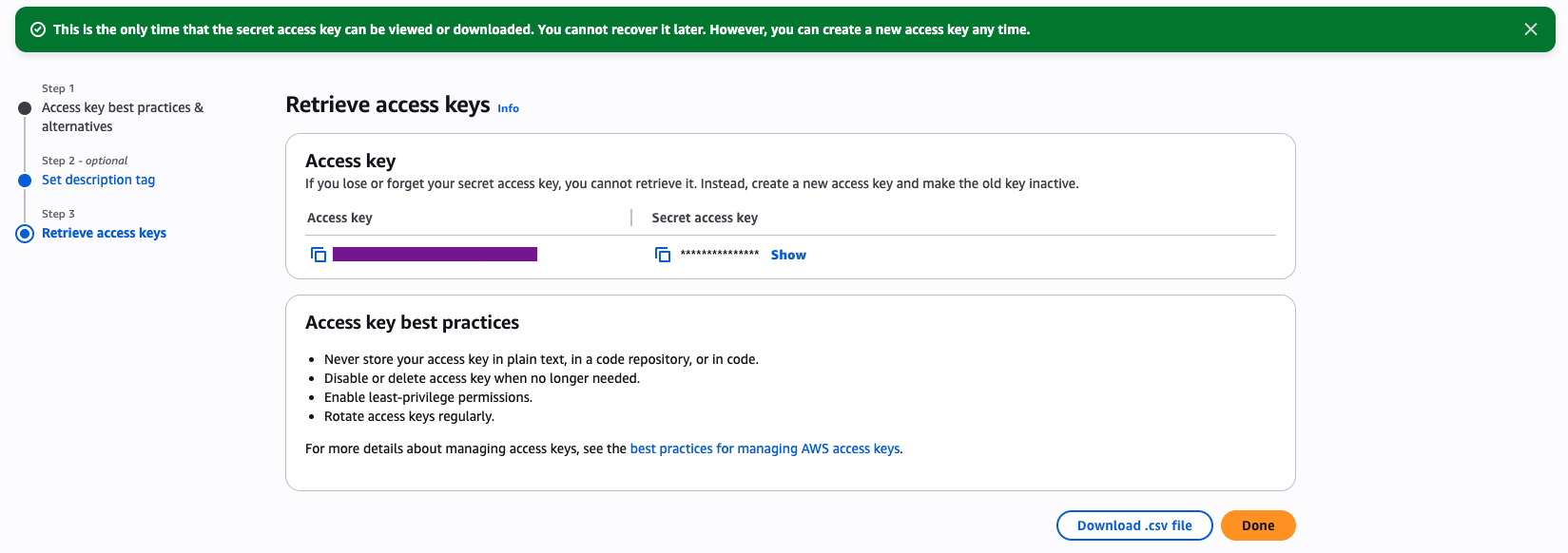 - Afterward, note the Access Key ID and Secret Access Key. The final required information for the integration is the Region value, which can be identified from the active Region displayed in the top-right corner of the AWS console.