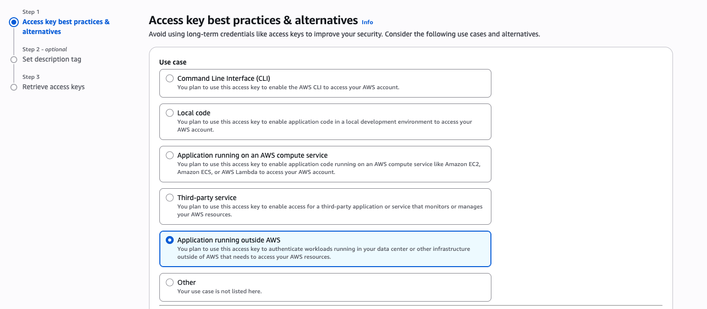 - Select Create Access Key. On the following screen, the Application Running Outside AWS option can be selected; this provides access based on the organization’s configuration.