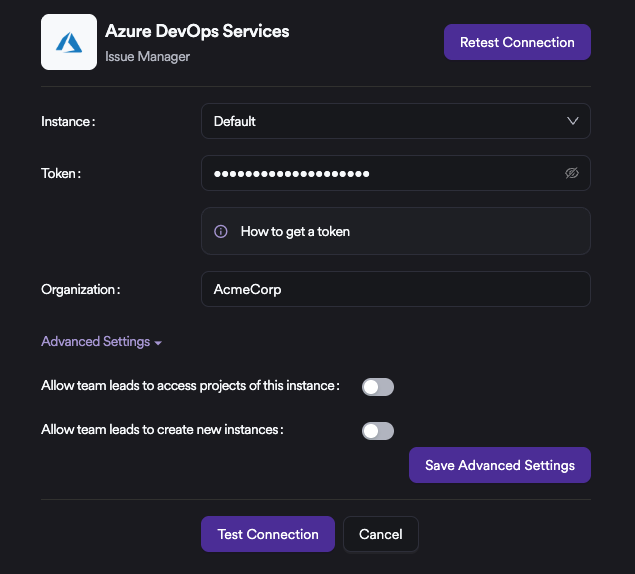 Under Advanced Settings, there are specific configuration options for Azure DevOps Services. When these toggles are enabled, the relevant permissions are granted not only to Administrators but also to Team Leads. This allows Team Leads to add their own organizations as new instances, onboard projects through these instances, and manage access to them independently.