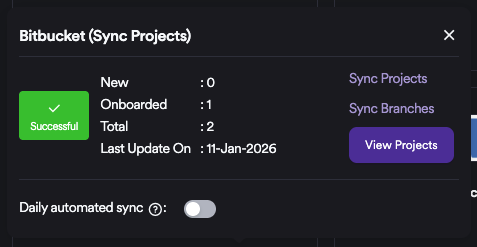 When the Daily Sync feature is enabled, the system synchronizes projects from Bitbucket on a daily basis and automatically onboards all projects that have not yet been onboarded. If the license project count is limited, enabling this feature is not recommended. The available project quota may be consumed rapidly, which can prevent new projects from being added to the system.
