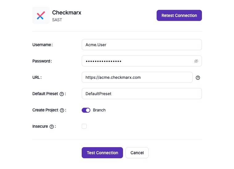 Once the service account is created, securely note the username and password. After preparing the Checkmarx base URL, you can proceed with the integration directly from the Invicti ASPM UI.