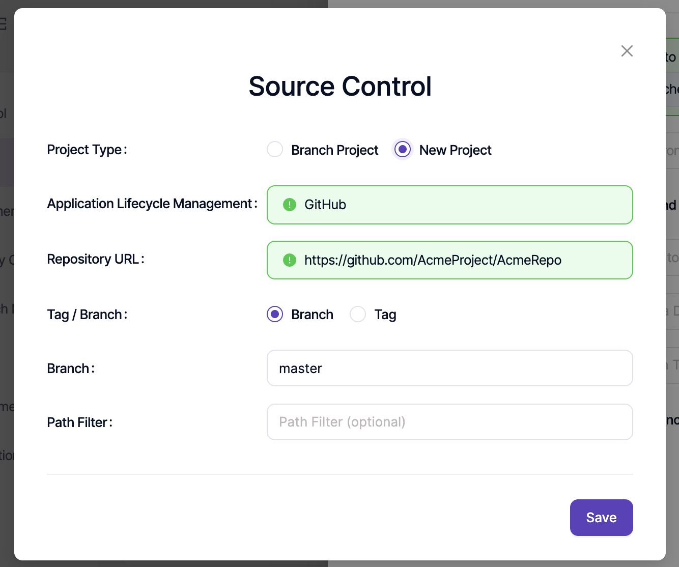 Next, choose how new projects will be created by selecting either the Project or Branch option. This selection determines the structure for all newly onboarded projects through KDT:
