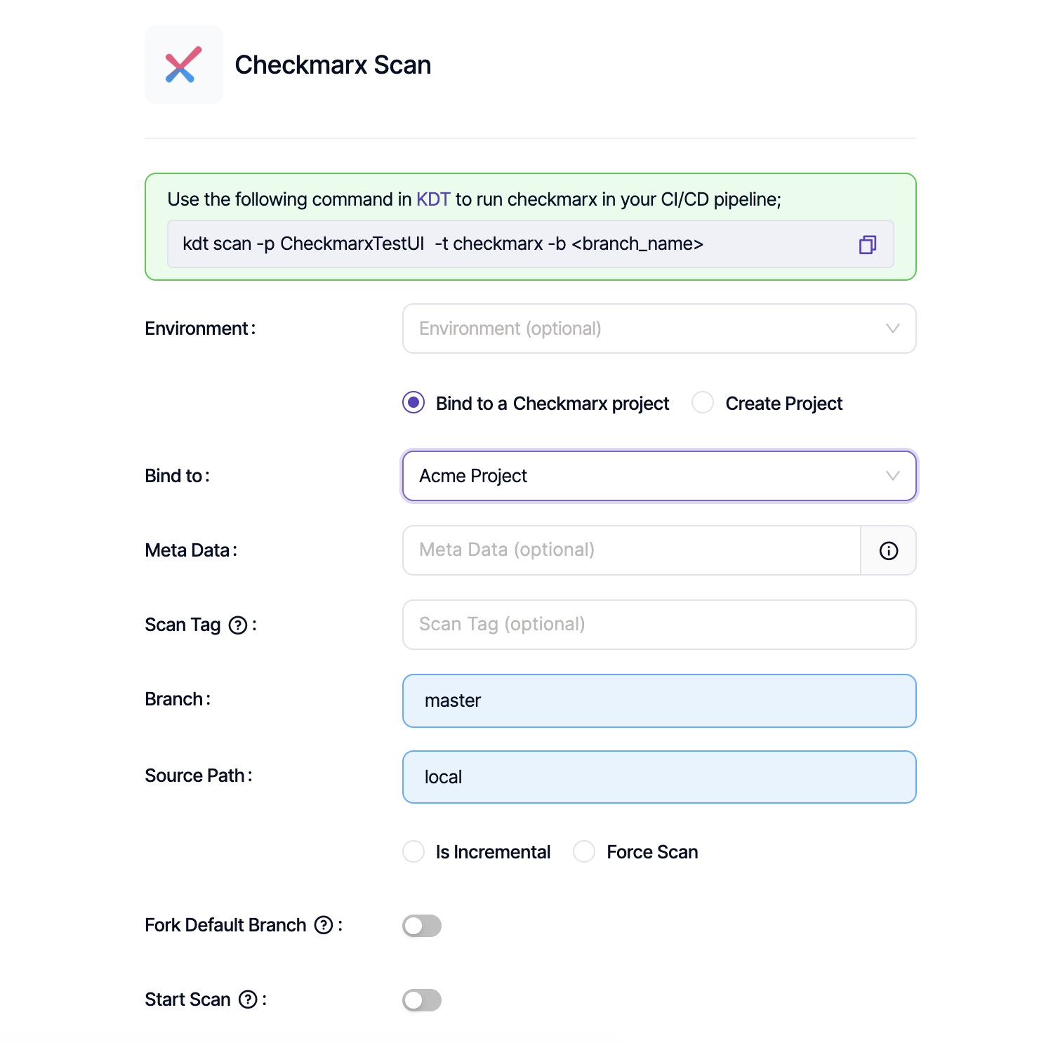 The Start Scan option determines whether a new scan will be triggered immediately, or if the latest existing scan result from Checkmarx will be fetched instead.