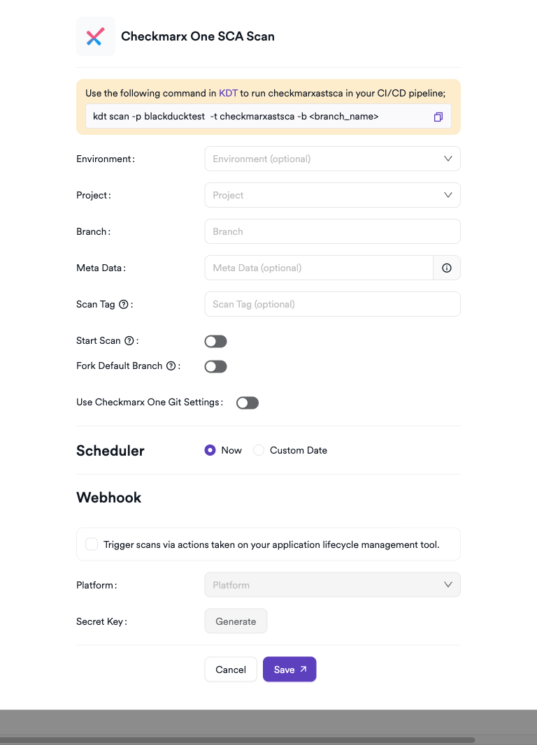 - When using CI/CD pipelines, enable Start Scan and use the KDT command to trigger scans programmatically.