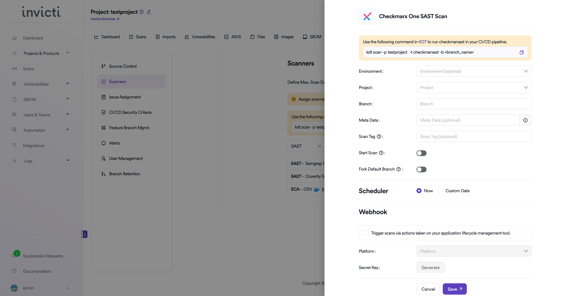 kdt scan -p <project_name> -t checkmarxast -b <branch_name>Click Save to create the scan configuration.