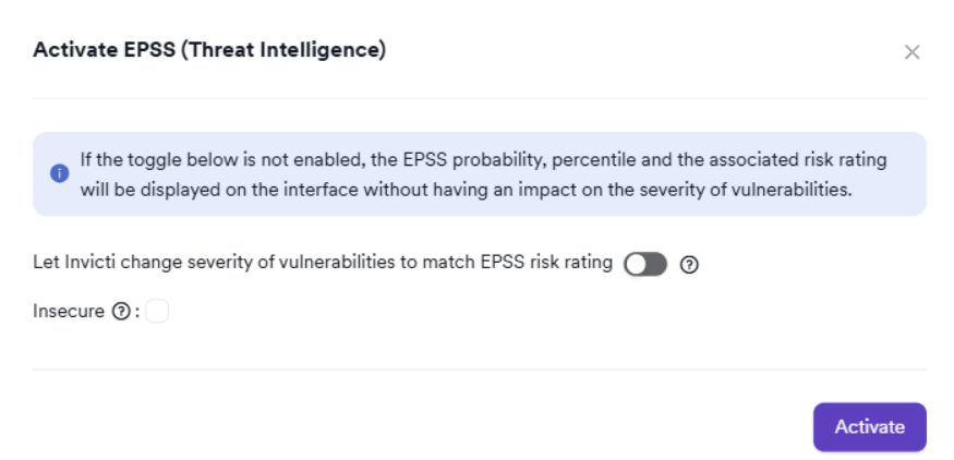 | Let Invicti change severity of vulnerabilities to match EPSS risk rating | When enabled, Invicti will override the scanner-reported severity of vulnerabilities to match the EPSS-derived risk rating calculated by the platform. This is an irreversible action — severities will not be automatically reverted if this setting is later disabled. |