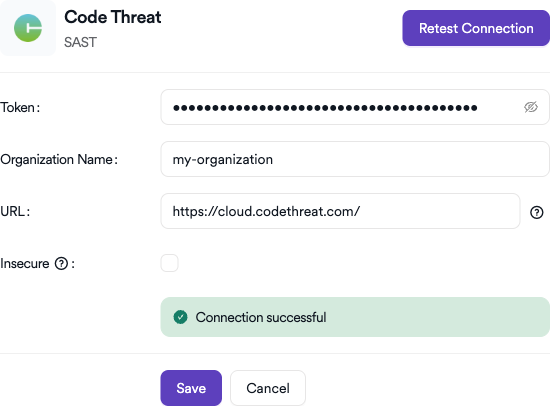 https://cloud.codethreat.com/for cloud or your self-hosted URL). - SSL Certificate Issues: If using a self-hosted instance with a self-signed certificate, enable the Insecure checkbox.