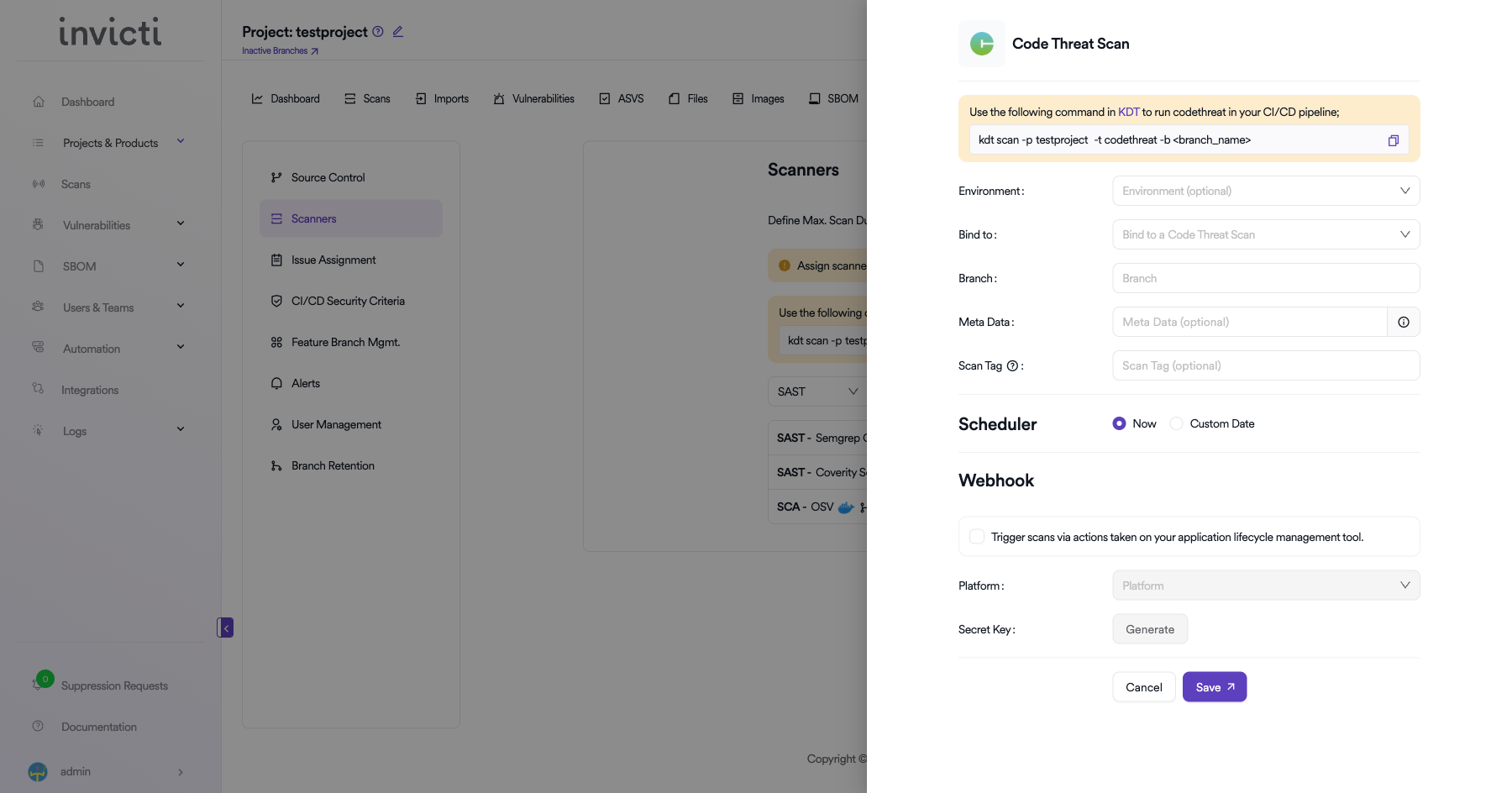 After activating and configuring Code Threat, you can create scans from your project's scanner settings.