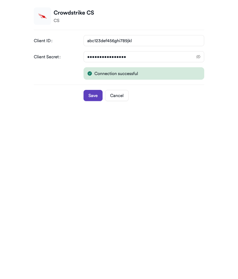 Note: CrowdStrike CS uses the Falcon cloud API — no URL field is required. The integration automatically connects to your CrowdStrike tenant's regional endpoint.