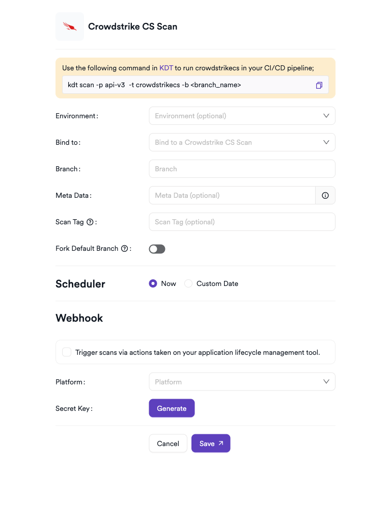kdt scan -p <project_name> -t crowdstrikecs -b <branch_name>Troubleshooting
