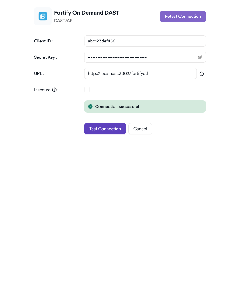 Insecure: Enable this checkbox only if your Fortify On Demand instance uses a self-signed SSL certificate.