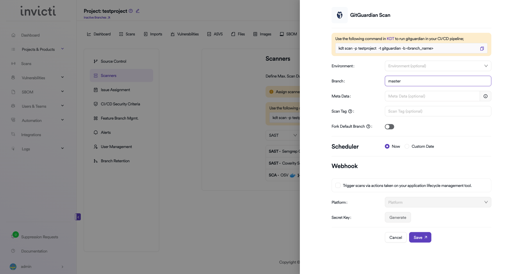 kdt scan -p <project_name> -t gitguardian -b <branch_name>Click Save to create the scan configuration.