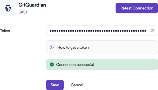 Click on the gear icon on the GitGuardian card to open the configuration panel. Fill in the required fields: