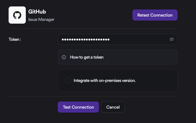 At this step, entering the token and clicking Test Connection is sufficient. If GitHub is running on-premises, the corresponding checkbox should be selected and the GitHub URL should be provided.