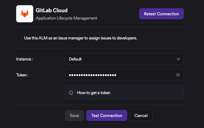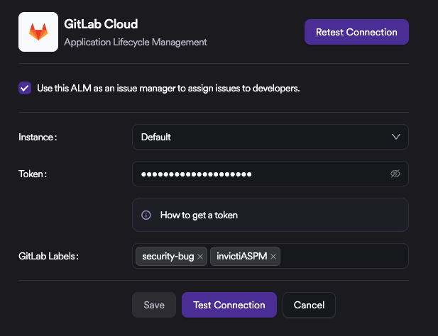 At this step, entering the token and clicking Test Connection is sufficient. If GitLab will also be used as an Issue Manager, the checkbox at the top of the list must be selected as well. When GitLab is used as an Issue Manager, an additional Label field becomes available. This setting applies only to issues that are created on GitLab through the Issue Manager integration. All issues generated by the system will be created using the specified labels.