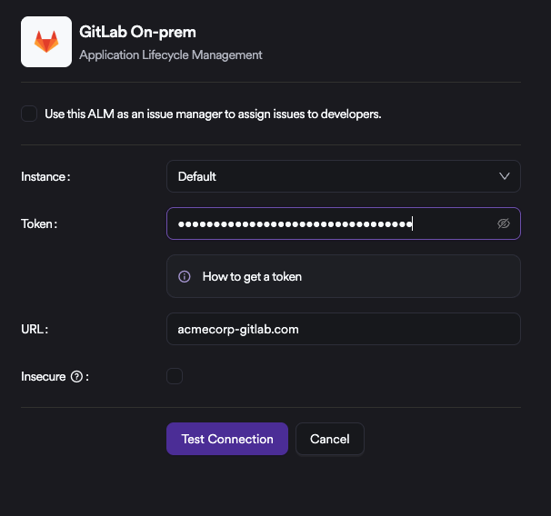 At this step, entering the token and clicking Test Connection is sufficient. If GitLab On-prem will also be used as an Issue Manager, the checkbox at the top of the list must be selected as well. When GitLab is used as an Issue Manager, an additional Label field becomes available. This setting applies only to issues that are created on GitLab On-prem through the Issue Manager integration. All issues generated by the system will be created using the specified labels.