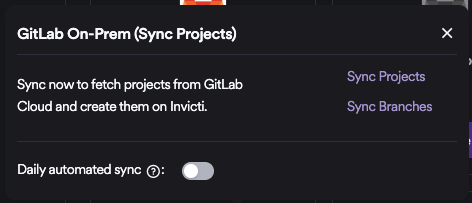 When the Daily Sync feature is enabled, the system synchronizes projects from GitLab On-prem on a daily basis and automatically onboards all projects that have not yet been onboarded. If the license project count is limited, enabling this feature is not recommended. The available project quota may be consumed rapidly, which can prevent new projects from being added to the system.