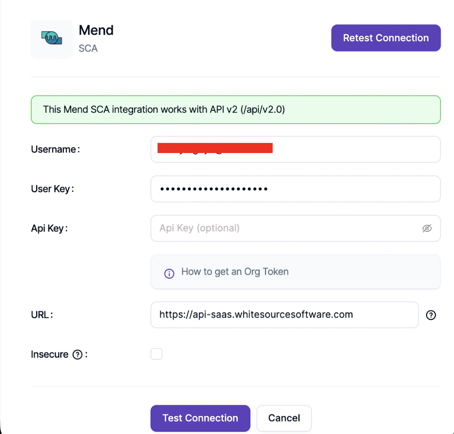 After generating your User Key, you can configure the Mend SCA integration in Kondukto using the following parameters: