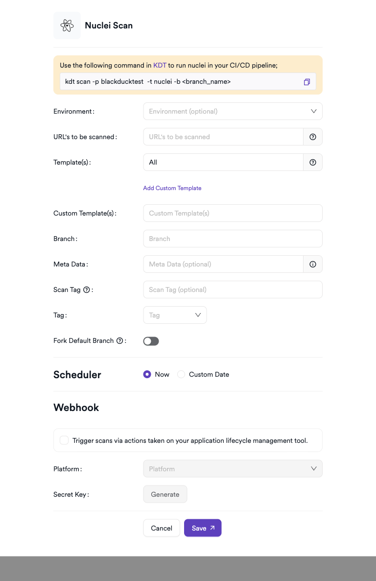 kdt scan -p <project_name> -t nuclei -b <branch_name>Troubleshooting