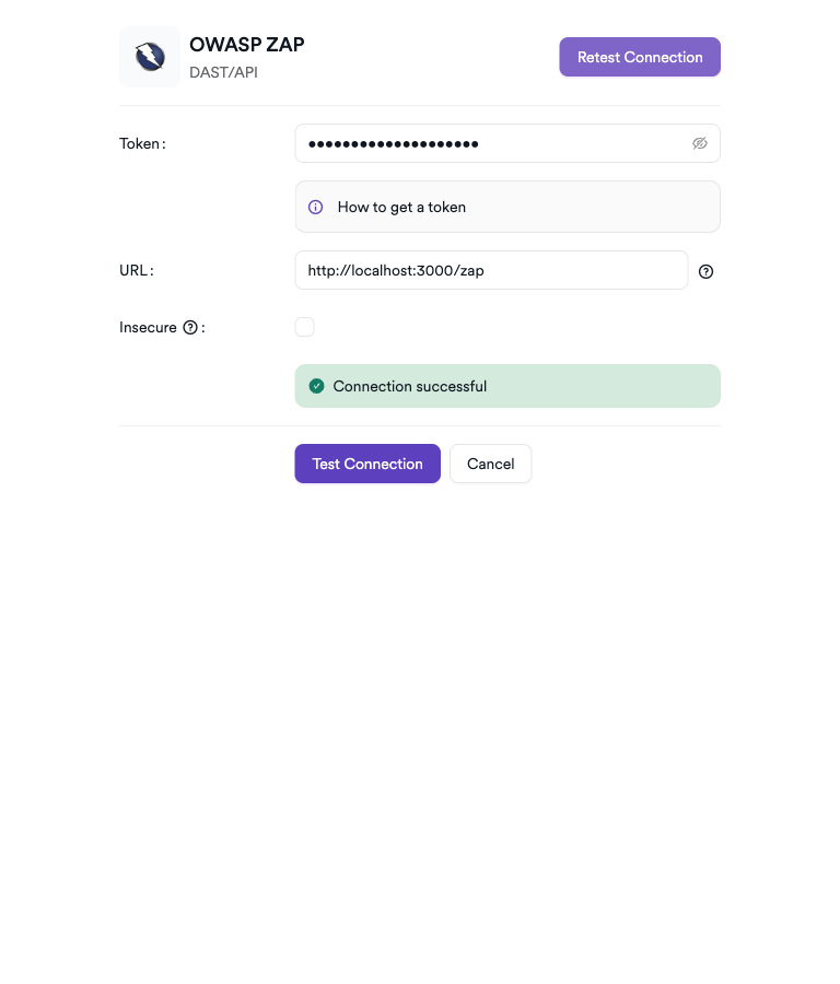 Token: Paste the API token from your OWASP ZAP instance.