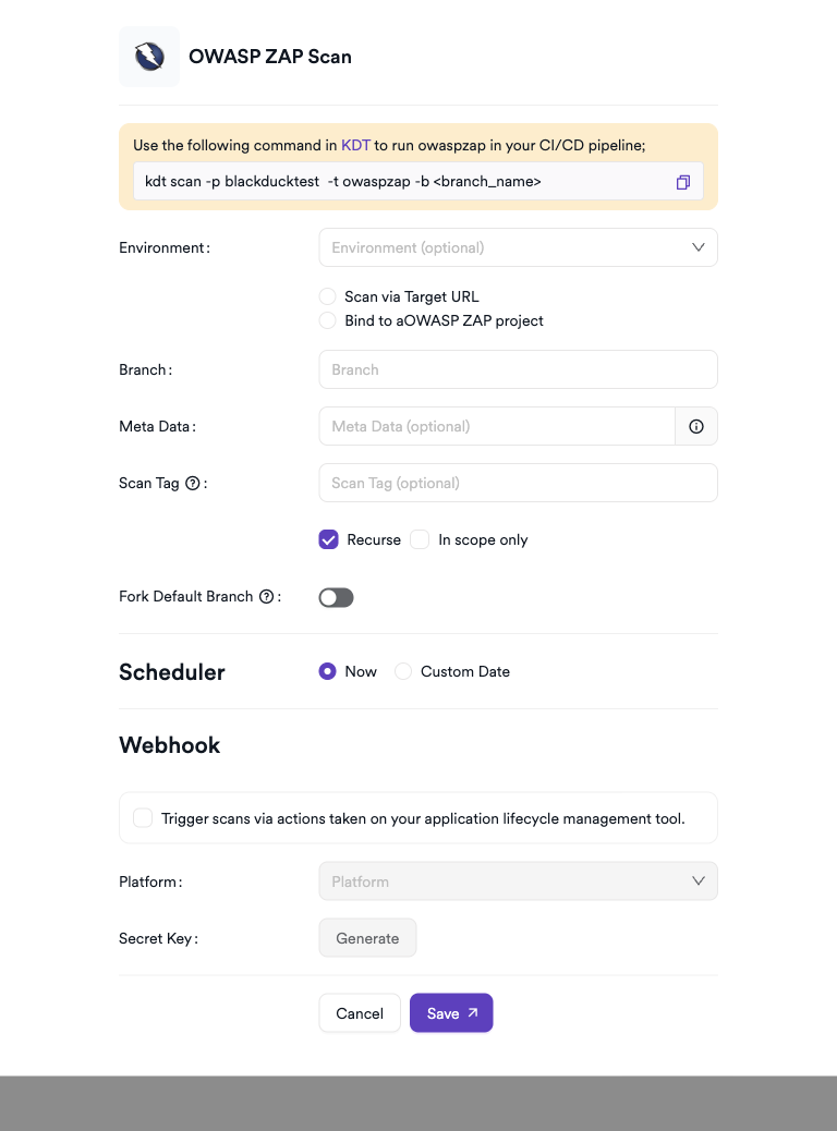kdt scan -p <project_name> -t zap -b <branch_name>Troubleshooting