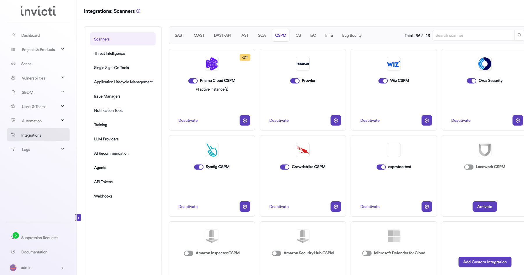 On the Integrations page, click on the CSPM tab to view the Cloud Security Posture Management scanners.