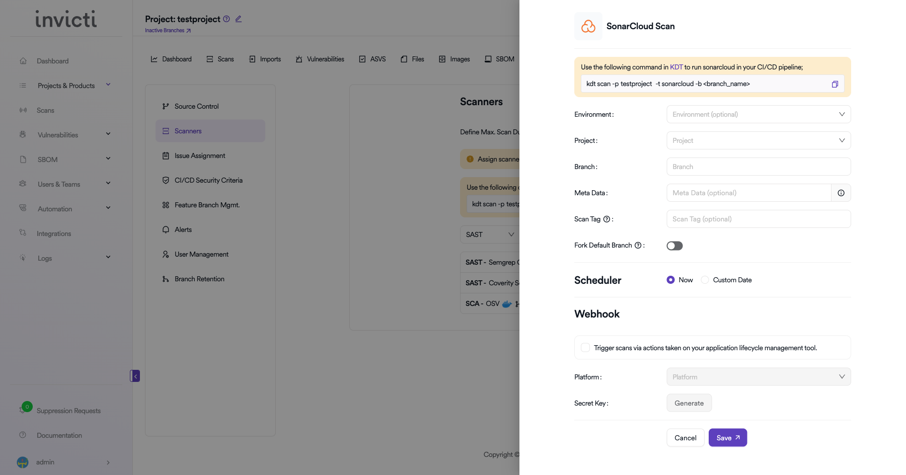 kdt scan -p <project_name> -t sonarcloud -b <branch_name>Click Save to create the scan configuration.