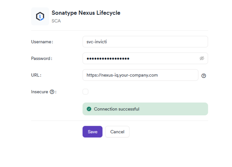 Requires existing Nexus IQ instance: Sonatype Nexus Lifecycle must already be installed and configured in your environment. Invicti AppSec connects to your existing server — it does not provision or manage Nexus IQ.